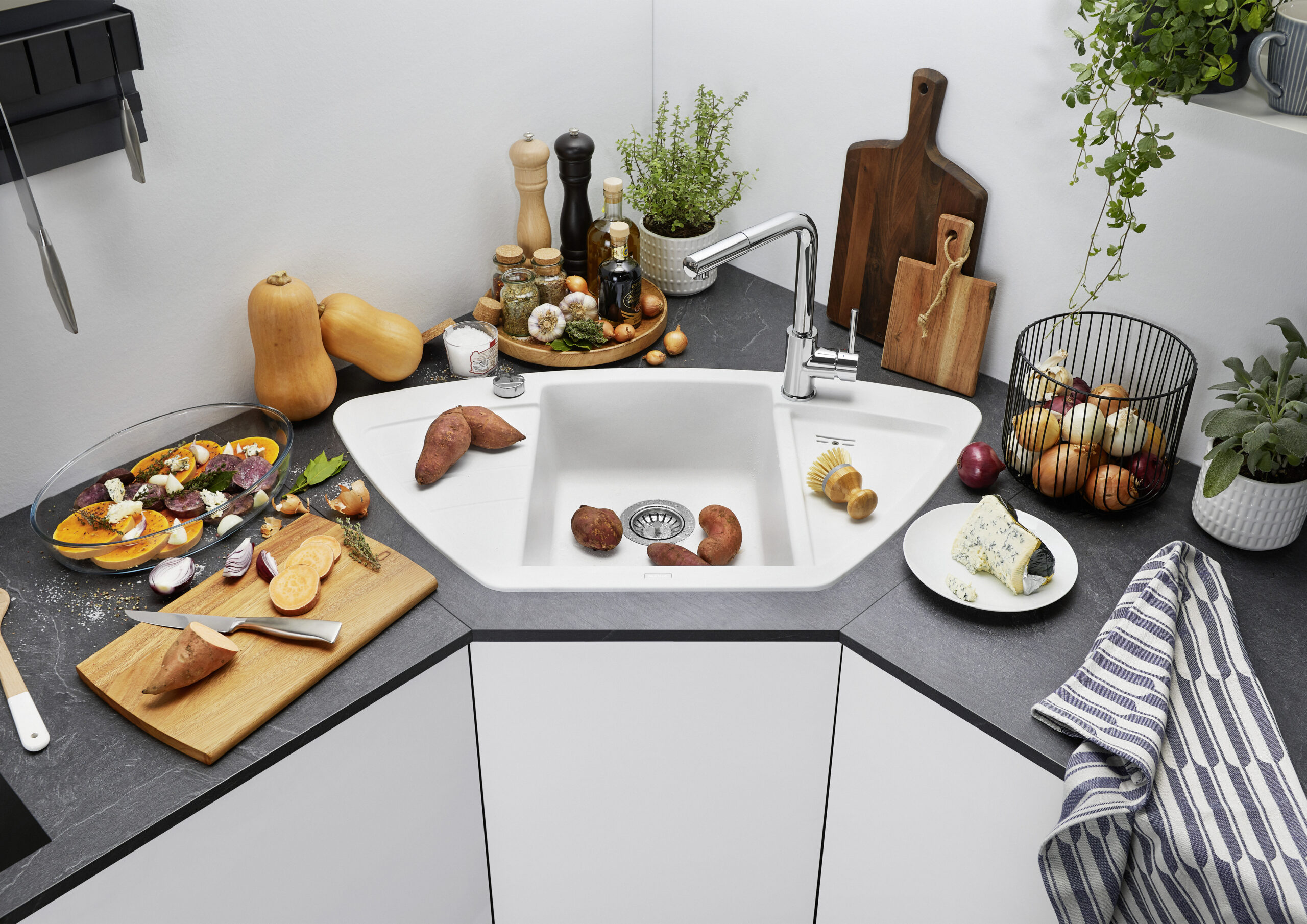 - Kompakte Abtropffläche und vertiefte Ausgusszone