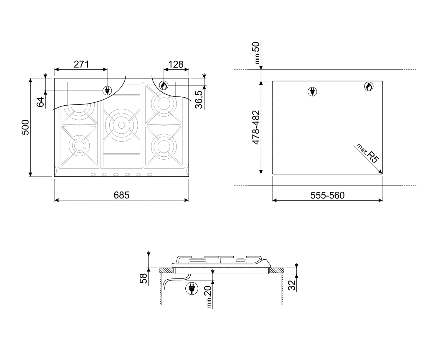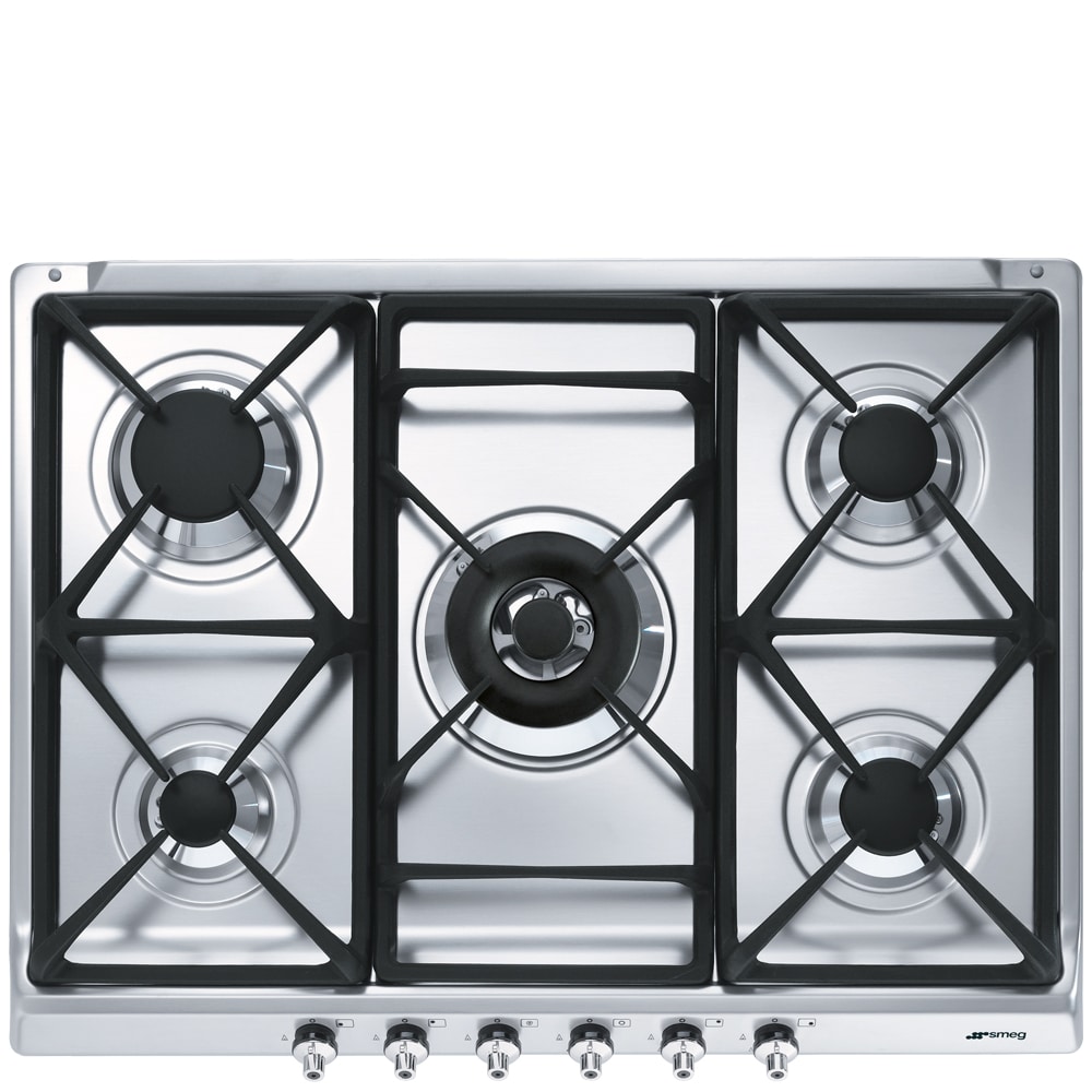 Einbau – Gaskochmulde, 70cm, Classici Design, Edelstahl, 5 Kochzonen, Regler Frontal, Guss – Abstellroste